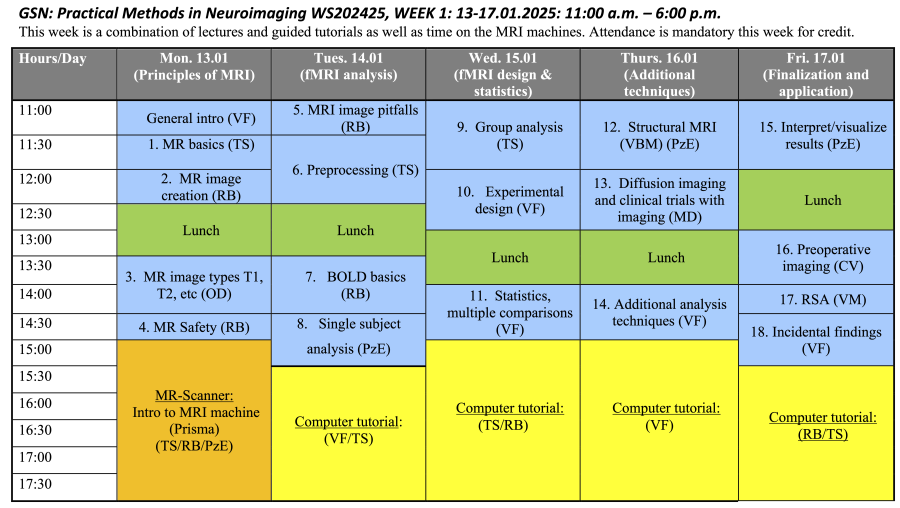 Concept: In the first week of the course, there will be theoretical lectures on the topics listed below. In addition, there will be guided tutorials on how to analyse fMRI and structural MRI data with SPM12. The tutorials are self-paced. In the second week, you will have to analyse a data set on your own (although we will be available if you have questions). You will be graded on a final report on this data set to be handed in by 18:00 on last day of the course.